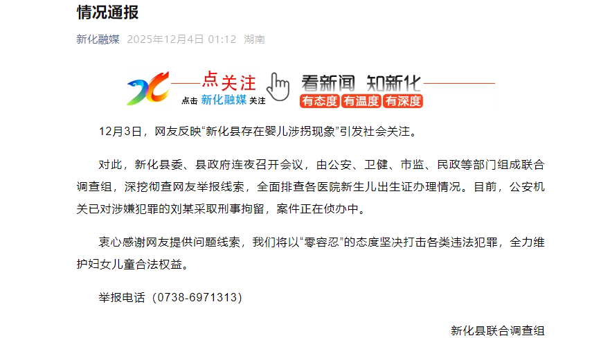 12月4日,湖南省娄底市新化县联合调查组发布情况通报:12月3日,网友反映“新化县存在婴儿涉拐现象”引发社会关注。2025-12-04 11:15
