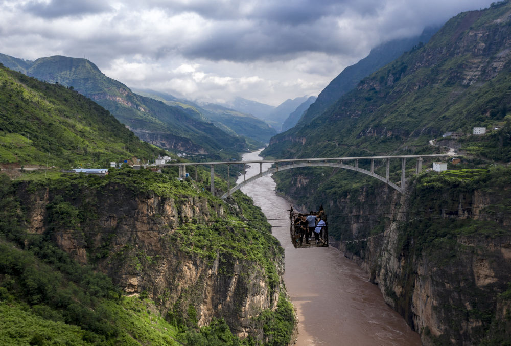 游客在体验云南省巧家县茂租镇鹦哥村村民蒋世学操作的溜索过江(新华社记者江文耀2020年8月14日摄,无人机照片)