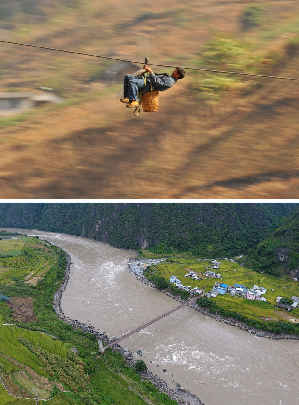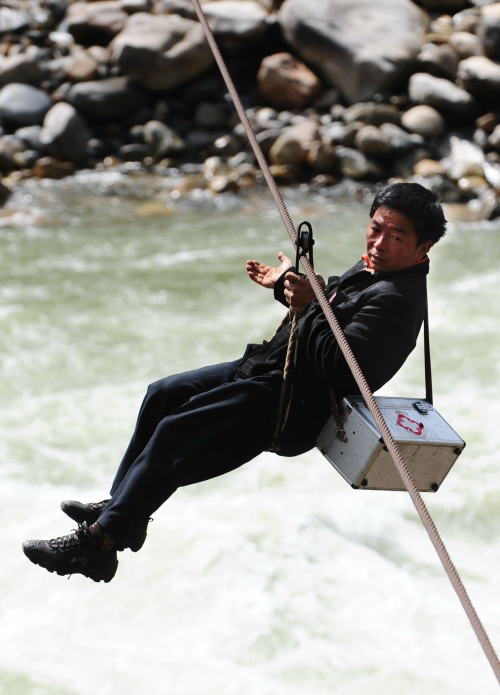 怒江把怒江州福贡县石月亮乡拉马底村一分为二,两岸村民要相见得爬几小时山路,溜索曾是便捷的交通工具,走亲戚、买东西靠它,就连医生出诊也要靠它。“走人马吊桥绕山路,过一次江需两三个小时,耽误病人就医。”拉马底村乡村医生邓前堆说。
