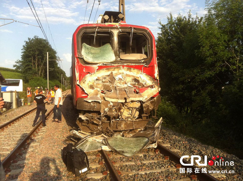 当地时间2014年7月17日,法国西南部比利牛斯-大西洋省发生一起两列同向行驶的火车追尾相撞事故,目前已造成至少40人受伤,其中4人伤势严重。(图片来源:R. BELY/CFP)