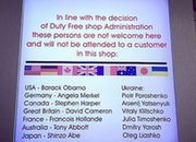 俄罗斯城市海参崴日前出现一个警示牌,禁止包括奥巴马、卡梅伦、安倍晋三等人在内的13名政客在此购买免税物品。