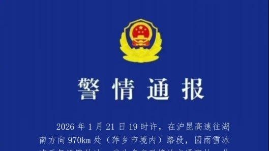 今日(22日),江西高速交警发布通报称:2026年1月21日19时许,在沪昆高速往湖南方向970km处(萍乡市境内)路段,因雨雪冰冻天气道路结冰,发生多车碰撞的交通事故,共造成1人死亡、4人受伤。2026-01-22 16:35