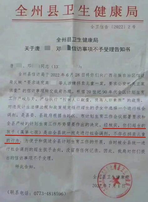 中国网7月5日讯 7月5日,一份落款为全州县卫生健康局发布的《关于唐某某、邓某某信访事项不予受理告知书》(下称《告知书》)引发热议。《告知书》中显示,20世纪90年代,广西为严格控制人口数量,对违反计生法律法规和政策规定强行超生的子女中“选择一个进行社会调剂”,被调剂的孩子的去向没有留存任何记录。