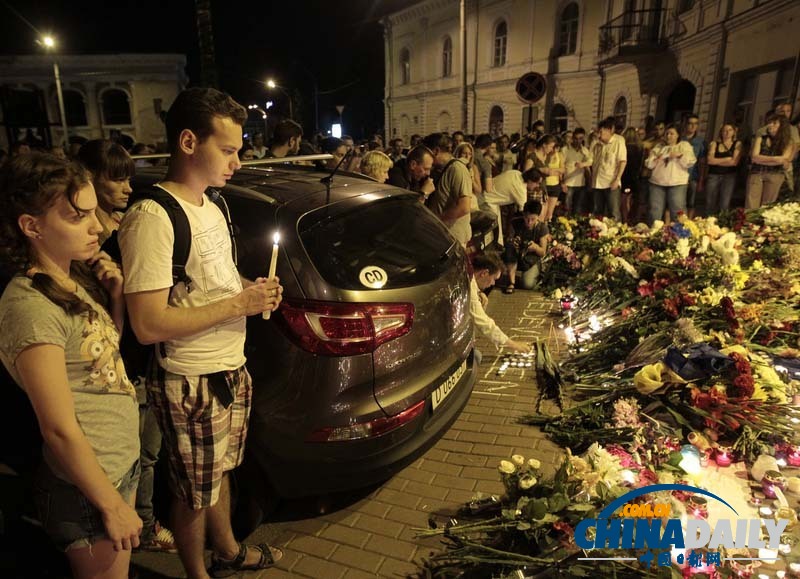 当地时间2014年7月17日,乌克兰基辅,民众在荷兰驻基辅使馆前点燃蜡烛和献花,悼念马航坠机死难者。据悉,一架载有298人的马来西亚航空公司波音777客机于7月17日在乌克兰境内靠近俄罗斯边境坠毁。乌克兰称马来西亚客机MH17上283名乘客和15名机组人员遇难,并称这架马航客机是被“分裂分子”发射的Buk地对空导弹击中的。(图片:东方IC)